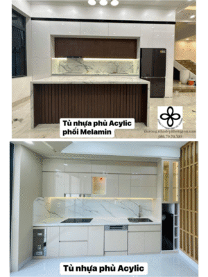 Phụ kiện đi kèm: Bao gồm bản lề giảm chấn, ray trượt, tay nắm, giá xoay, kệ úp chén, bếp âm, máy hút mùi… giúp thi công tủ bếp hiện đại trở nên tiện nghi và thông minh hơn.